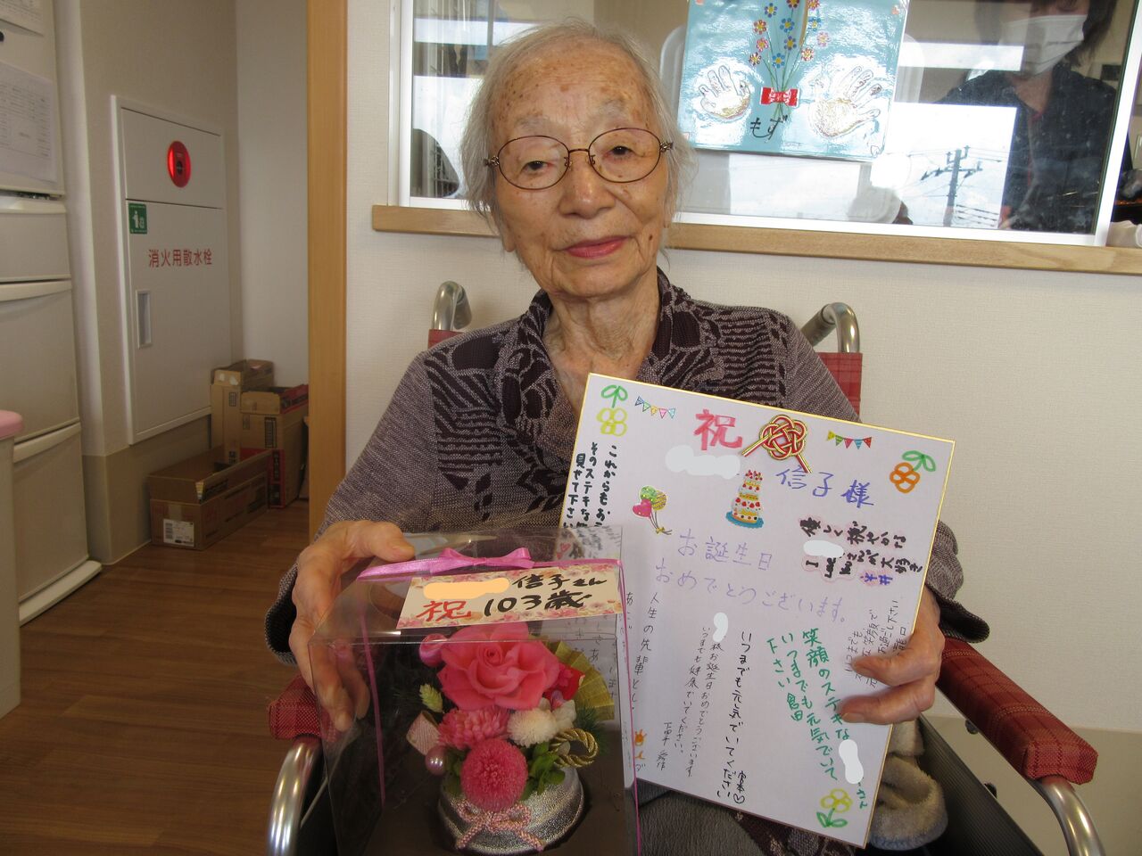 2021年09月22日 103rd Happy Happy Birthday💛 大正7年9月22日。ノブコさんは、この世に生を受けた。そして今日103回目の誕生日ひだまり最高齢のご利用者です。先日の「敬老会&誕生会」でケーキを贈呈そして本日ユニットスタッフから、心のこもった色紙とプリザーブドフラワーを贈りましたとても103歳には見えずお顔に張りとツヤがあり、穏やかな性格で受け答えもしっかりとなさっておられる…。 まだまだこれからもひだまりで、楽しくお元気に暮らしていただきたいなぁ。本当におめでとうございます 「こまどり・もずユニット」カテゴリの最新記事 < 前の記事次の記事 > コメント コメントフォーム 名前 コメント 記事の評価 リセット リセット 顔 星 情報を記憶 コメントを投稿する