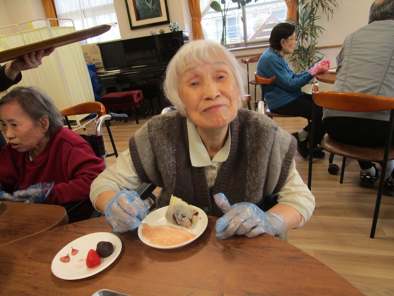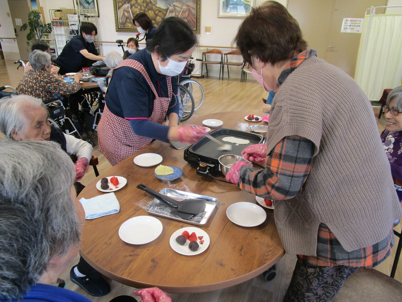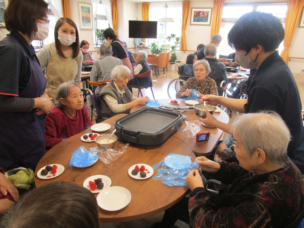 2024年02月08日 季節先取り!桜餅作り! 暦の上では、春。実際には、まだ春は遠いですが・・・たぶん、全国の特養の中でも桜餅作りは、早いほうから5本の指に入るのではないでしょうか ホットプレートで、生地を焼き・・・イチゴとあんこを包み桜の花びら🌸を載せて、でき上がり~~🎵生地も紅白で、めでたい感じです皆さん、今月も大満足のおやつクラブでした 「おやつクラブ」カテゴリの最新記事 < 前の記事次の記事 > コメント コメントフォーム 名前 コメント 記事の評価 リセット リセット 顔 星 情報を記憶 コメントを投稿する